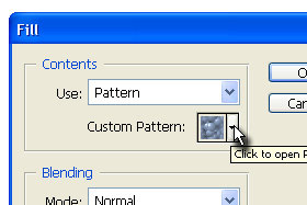 Kliknite zgoraj na Edit in izberite Fill... V novem oknu polju Use določite preko izbirnika Pattern. Potem pa kliknite na puščico navzdol (glej sliko) pri kvadratku, ki predstavlja polje Custom Pattern. |