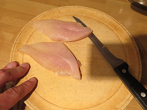 Pripravite piščančja prsa in z nožem narezite toliko zrezkov, kolikor jih želite pripraviti. |