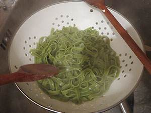 Ko se bodo špinačni rezanci skuhali, jih postavite v posodo, ki prepušča vodo, da jih odcedite. |