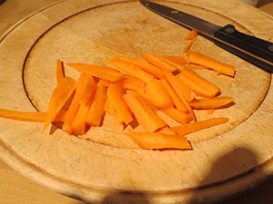 Vzemite kos korenja in ga narezite na zelo majhne koščke. Jaz sem korenje še prej dobro očistil, tako da sem ga z rezilom prej olupil. |