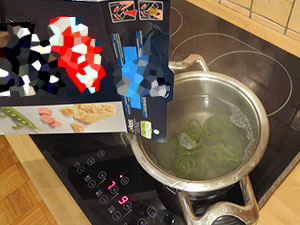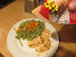 Ko se bo voda segrela, vstavite široke špinačne rezance. Ko sem to storil, sem se istočasno lotil še piščančjih zrezkov, vendar v tem receptu raje pokažem ločeno, da ne bo pomote. |