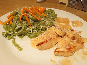 Postavite rezance in piščančje zrezke z omako na krožnik in nato naribajte malo parmezana. |