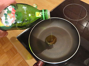 Potem postavite ponev na kuhalno ploščo z nastavljeno srednje močno temperaturo ter vlijte malo olivnega olja. |