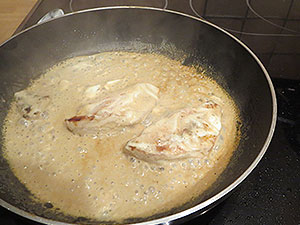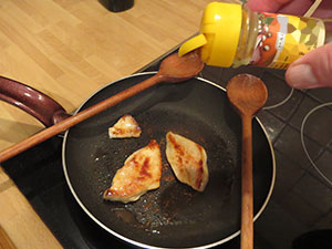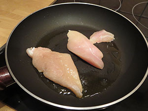Potem na segreto ponev postavite piščančje zrezke, katere ste pripravili na začetku. |