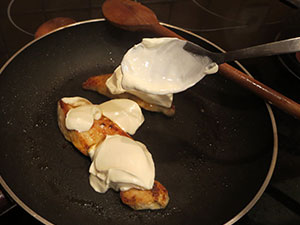 Ko bodo zrezki pečeni, dodajte nekaj večjih žlic kisle smetane in začnite mešati, da se dobro stopi in premeša skupaj z mesom. Lahko dodate kar cel lonček kisle smetane.
