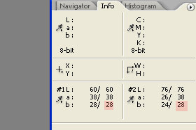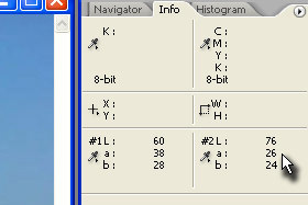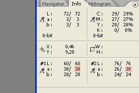 Nastavljajte sivi in beli drsnik tako, da bo v oknu Info desno polje b enako levemu polju b (glej sliko, označeno z rdečo).