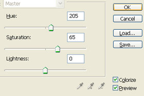 Odpre se okno za nastavljanje barve. Označite Colorize. Hue nastavite 205, Saturation 65 in Lightness 0. Kliknite na gumb OK. |