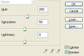 Odpre se okno za nastavljanje barve. Označite Colorize. Hue nastavite 200, Saturation 50 in Lightness 0. Kliknite na gumb OK. |
