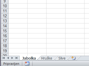 ![]() V mojem primeru imem tri liste v Excelu. Prvi list so Jabolka, drugi Hruške in tretji Slive.