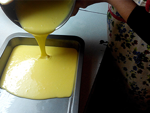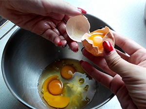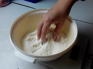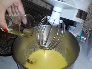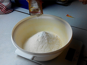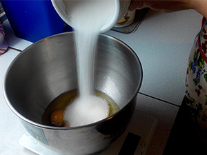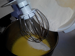Moko s pecilnim praškom postopoma dodajamo in vmešamo v našo jajčno zmes. |