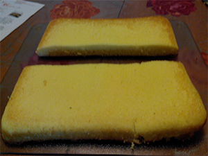 Biskvit prerežemo na polovico. Tako dobimo dva enaka pravokotnika iz biskvita. |