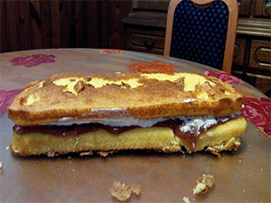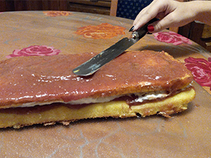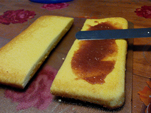 En pravokotnik premažemo z marmelado. Uporabite lahko katerokoli marmelado. Čisto po vašem okusu. V mojem primeru je to domača jagodna marmelada. |