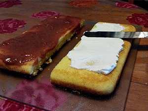 Sedaj s pravokotnikom, premazanim s kislo smetano, pokrijemo pravokotnik z marmelado tako, da se kisla smetana in marmelada sprimeta. |