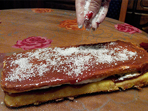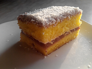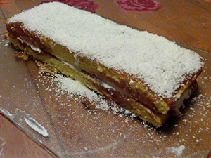 Ter za konec po marmeladi potrosimo kokosovo moko. Uporabimo je toliko, da pokrijemo celotno marmelado. |