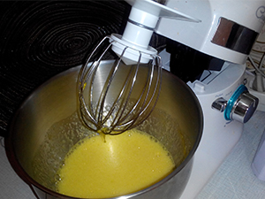 Vanilijev sladkor, sladkor in jajca penasto umešamo. |