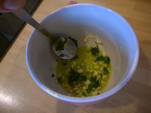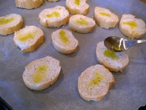 Mešanico olivnega olja s česnom in peteršiljem sedaj namažite po kruhkih. |
