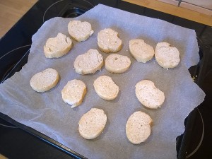 Pripravite pekač in nanj postavite peko za papir. Potem pa postavite narezane kose kruha nanj. |