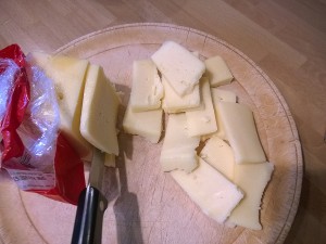 Pripravite sir in ga narežite na manjše koščke. Najbolje se bodo obnesli siri, ki se hitro topijo, kot so na primer livada ali pa mozzarela.
