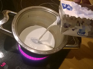 Ko se bo mleko delno segrelo, dodajte dve zvrhani žlici mlečnega zdroba vanj.