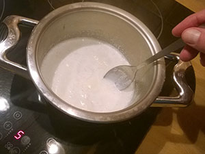 Mešajte približno 2-3 minute, da bo postala zmes bolj gosta, vendar pa ne sme biti preveč.