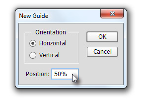 ![]() Sedaj bomo dokument razdelili, da bomo vedeli, kje se nahaja sredina. Kliknite zgoraj na View in izberite New Guide. Nato pa Orientation nastavite Horizontal, Position 50% in potrdite s klikom na gumb OK. |