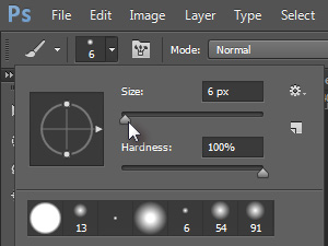 ![]() Nato zgoraj kliknite na izbirnik čopičev (glej sliko) in nastavite čopiču debelino na 6 px in Hardness 100%. |