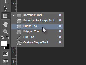 ![]() Narisali bomo sedaj obliko kroga, kateremu bomo tudi nato dodali črto s prej nastavljenim čopičem. Izberite orodje Ellipse Tool. Držite z miško na orodju Rectangle Tool (bližnjica je tipka U) toliko časa, dokler se vam ne prikažejo ostala orodja.