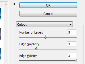 ![]() Kliknite zgoraj na Filter in izberite Filter Gallery... V novem oknu označite Artistic in nato Cutout. Nastavite poljubne vrednosti in ko boste zadovoljni, kliknite na gumb OK. |