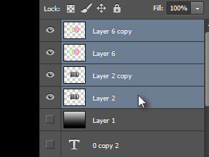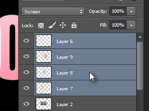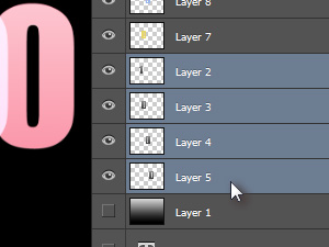 ![]() Ta vodič se nadaljuje, zato sledite naprej navodilom, ali pa odprite PSD datoteko, katero ste shranili v prvem delu. Nato držite tipko Ctrl (Command na MacOS) in označite vse layerje z efektom preliva. |