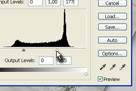 Pritisnite tipki CTRL + L, da se odpre okno Levels. Počasi premikajte beli drsnik proti levi strani (glej sliko) in istočasno glejte na vašo sliko. Ko boste zadovoljni, kliknite na gumb OK. |