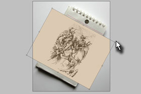 Pritisnite tipki CTRL + T, da sliko transformirate tako, da se bo prilagodila papirju. Držite jo za rob in jo tako pomanjšujete in obražate okoli osi. |
