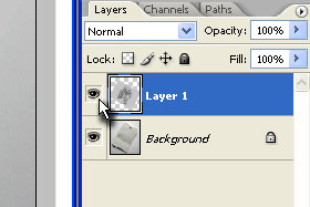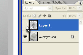 V paleti layerjev kliknite na znak, ki predstavlja oko (glej sliko), da boste skrili zgornji layer.