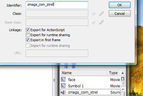 Kliknite zgoraj na File, Import in izberite Import to Library. Izberite poljubno datoteko in kliknite na gumb Open. Kliknite tukaj za prenos datoteke, ki sem jo jaz uporabil. Zvočna datoteka se je dodala v knjižnico. Kliknite na to datoteko z desnim miškinim gumbom in izberite Linkage. Odpre se novo okno. Označite Export to ActionScript in kliknite na gumb OK. |