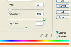 Označite Colorize. Potem pa nastavite Hue 20, Saturation 100 in Lightness 0. Kliknite na gumb OK. |