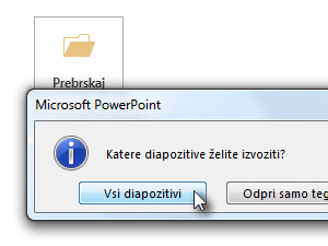 ![]() Program vas vpraša, ali naj shrani vse diapozitive ali samo enega. Kliknite na Vsi diapozitivi. Ko bodo slike shranjene, se bo pojavilo pogovorno okno z informacijo o izvozu slik. |