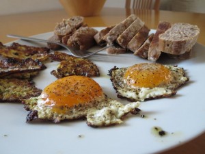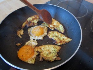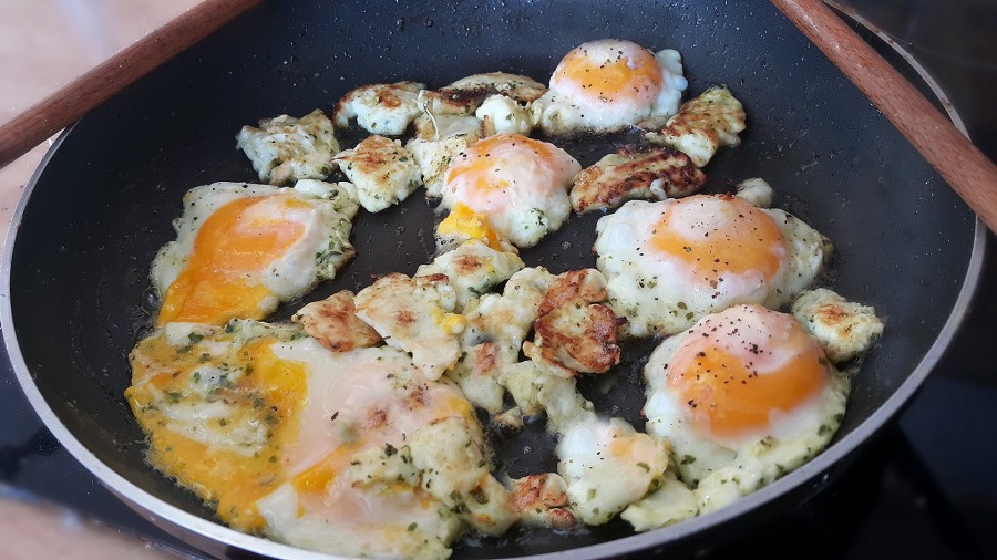 ... bo razdeljen na večje kose in jih nato tudi obračajte, da se dobro popečejo na obeh straneh. Ko bo beljak in rumenjak dobro popečen, ga s pomočjo lopatice postavite na krožnik. V mojem primeru sem počakal, da rumenjak postane rjavkaste barve. |