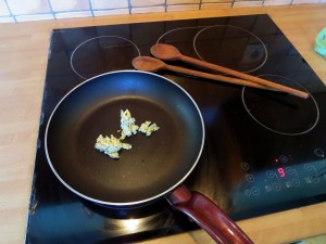 Pripravite zeliščno maslo in ga v koščkih po želi (glej sliko) postavite na ponev. Nastavite kuhalno ploščno na najvišjo temperaturo in pripravite dve kuhalnici. |