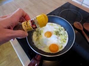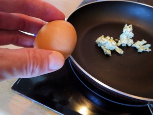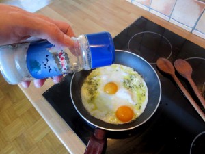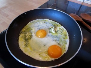 Počakajte, da se ponev segreje in da se zeliščno maslo začne topiti. Potem pa pripravite dve jajci in ju s pomočjo noža ali roba ponve razbijte ter zlijte na ponev. Pazite, da se rumenjka ne razlijeta. Če pa se bosta, pa ni problema, jed bo na koncu vseeno dobra. |