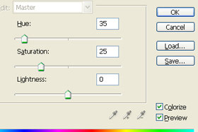 Označite Colorize. Hue nastavite 35, Saturation 25 in Lightness 0. Kliknite na gumb OK. |