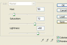 Označite Colorize. Hue nastavite 50, Saturation 72 in Lightness 60. Kliknite na gumb OK. |