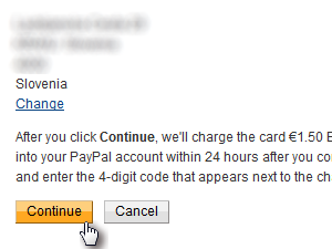 ![]() Izpisalo se bo obvestilo, da bodo iz vaše kreditne kartice trgali znesek 1,5 EUR. Po potrditvi, bo ta znesek v roku enega dneva nakazan nazaj na vaš račun.