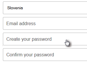 ![]() Za državo izberite Slovenia, nato pa še vpišite vaš elektronski naslov in poljubno geslo ter za namene preverjanja še enkrat isto geslo.