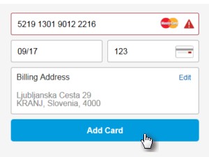 ![]() Za plačevanje na PayPal je obvezna kreditna kartica. Zato boste v zadnjem koraku boste morali vnesti še številko kreditne kartice, datum njene veljavnosti in trimestno kodo, ki se nahaja na koncu številke na hrbtni strani kartice. |