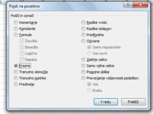 ![]() Označimo PRAZNE in potrdimo z V REDU. Pozor: s tem bomo poleg vseh popolnoma praznih vrstic odstranili tudi vrstice, kjer naslov ne obstaja, vendar so v ostalih celicah te vrstice še drugi podatki.