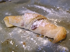 Tako, da bo zavit do konca, zavihke pa zlepite skupaj, da se med peko čokoladni namaz ne bo razlil ven. |