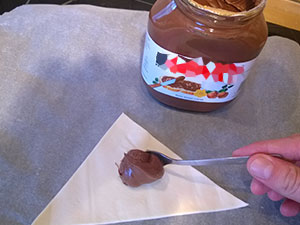 Pripravite čokoladni namaz in ga postavite na sredino trikotnika iz listnatega testa. |