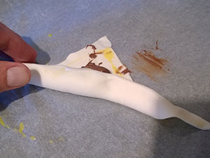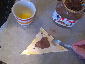 Čokoladni namaz naj ostane na sredini trikotnika. Potem pa robove testa namažite z prej premešanim jajcem. |