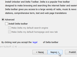![]() Sedaj pritisnite Naprej in potem Se Strinjam. Ko pa se vam odpre naslednje okno, izberite Advaned in odkljukajte vse okvirčke. Če tega ne boste storili, se vam bo na računalnik namestila vrstica Delta toolbar, spremenila pa se vam bo tudi domača stran brskalnika in sam iskalnik v brskalniku. Nato pritisnite dvakrat Naprej in na koncu Namesti. |