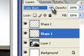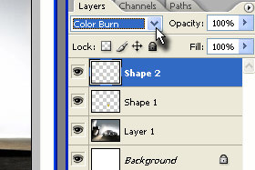 Potem pa označite Shape 2 in mu določite senčenje na Color Burn (glej sliko).