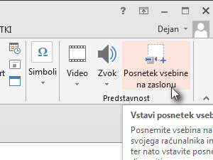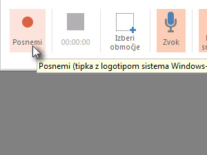 ![]() PowerPoint se bo skril, kjer z miško določite del zaslona, katerega želite zajeti. Odprite aplikacijo, katero želite predstaviti, nato v PowerPointu začnite snemanje in ponovno se vam bo prikazala aplikacija. Vrstni red pač. |